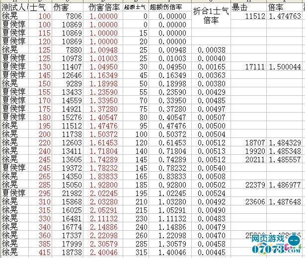 第六:暴击大概是普通攻击的1.475-1.5倍(夏侯惇怎么130士气的暴击就超过徐晃360士气暴击的加成),但可以总结一点,士气越高,暴击加成越多,但涨幅很小。
