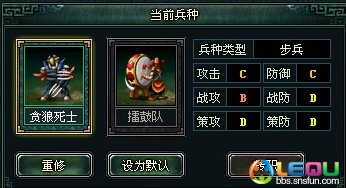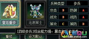 不俗的三防,物理防御、战法防御、计策防御都算还不错,这次仅次于胖子的一个肉盾首选兵种,毕竟兵种不是那么好刷的,1/8的几率刷出,所以这个兵种可以勉强代替胖子抗一下。