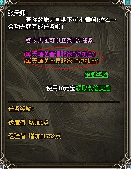 1、伏魔任务:会员每天可以免费做10次,普通玩家每天可以做5次(另外,可在商城购买伏魔卷继续伏魔任务哦)