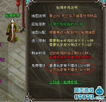 2、秘境修炼:会员每天可以有240分钟免费挂机,普通玩家每天可以有120分钟的免费挂机时间(商城的秘境修炼珠在免费挂机时间结束时,便可派上用场)