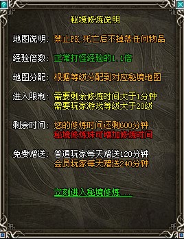免pk挂机地图,玩家可以尽情享受升级的快感!在龙城找到密境使者,即可进入挂机地图,如图,
