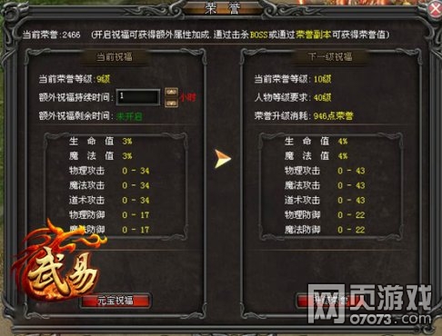 在荣誉界面中玩家可以选择“元宝祝福”,或者“升级祝福”的功能,当玩家拥有足够的荣誉值以及荣誉对应等级后,即可升级荣誉。每次升级荣誉默认开启荣誉祝福。37《武易》中的荣誉祝福是一种增益BUFF,荣誉祝福BUFF可以提升人物的多项属性,包括生命值,魔法值,攻击力,防御力,荣誉等级越高,祝福属性越给力。