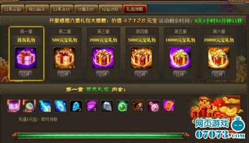 【活动内容】:从开服当日起,只要玩家的角色是第一次在游戏里进行充值,不限制任何金额,除了能获得“首次充值礼包”外,还可以领取 豪华累计充值礼包,限量超炫坐骑,唯美梦幻时装,可爱萌宠,强力紫装……机会难得,赶快行动吧!