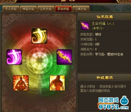5、【仙术】界面中增加“家族技能”标签,可快速查看、学习家族技能。