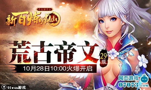 91wan《新百炼成仙》双线29服“荒古帝文”将于2013年10月28日10点火爆开启,诚邀您与我们一块进入成仙之旅!