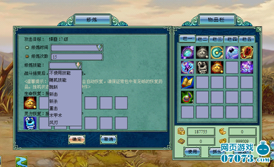2、弹出挂机修炼设置界面,除了选择修炼方式外还可以单独修炼某项技能,界面下方空格中放入药瓶可以在战斗中自动回复生命和灵力值。如下图