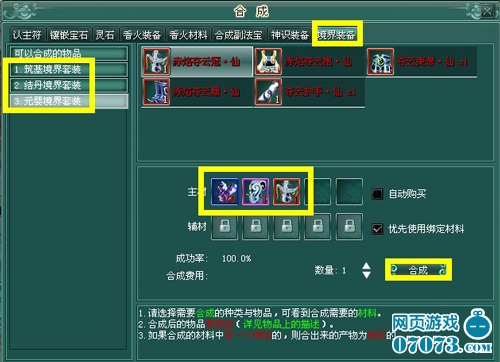 目前游戏中境界套装分成三类:筑基境界套装、结丹境界套装、元婴境界套装