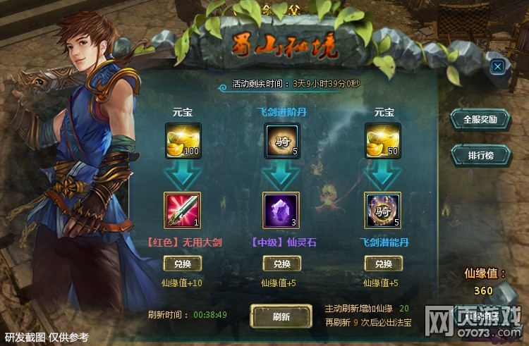 3) 可花费元宝立即刷新出下一批3条兑换道具及条件,每次立即刷新可获得一定的仙缘值,使用仙缘值可在蜀山密境中的仙缘商店中兑换稀有道具连携技升级石、景天&雪见信物碎片、太清真人信物碎片、金钻石、魔翳信物碎片。