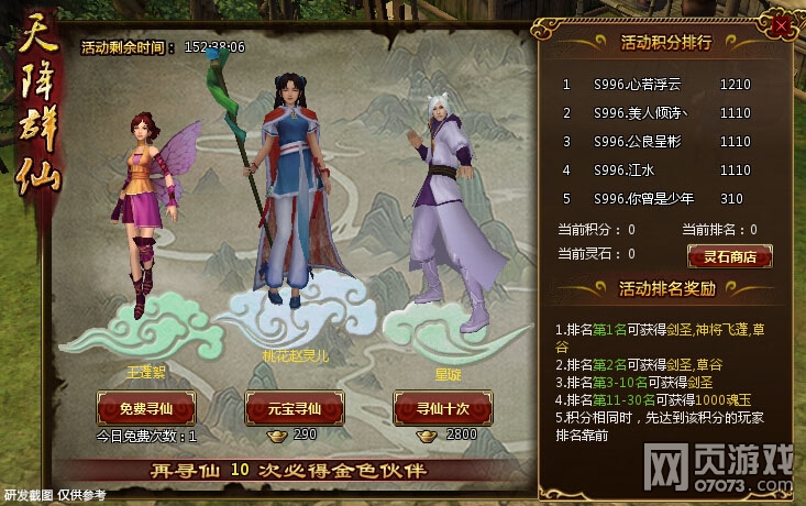 1)活动期间,每天玩家可免费在天降群仙中寻仙1次,也可花费元宝继续寻仙。