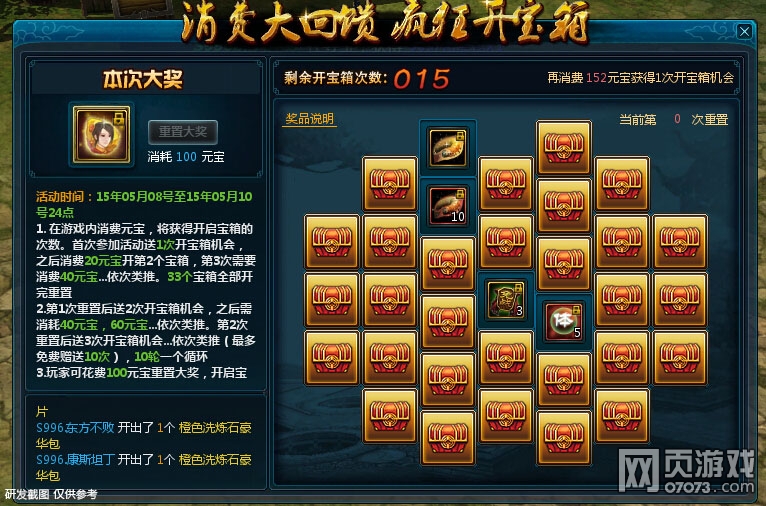 2)活动期间内玩家可花费100元宝重置大奖,开启宝箱后将无法重置大奖。
