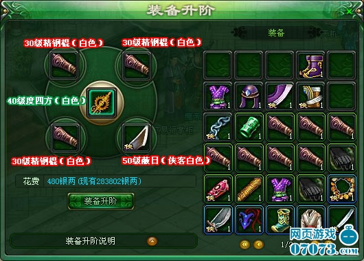 装备升阶的条件很轻松,假如我们要把一件30级的绿色装备升到蓝色,需要另外准备4件辅助装备,辅助装备等级20—40级都可以,品阶必须是绿色、蓝色或以上,辅助装备除了等级与品阶外,没有其他限制,可以用侠客装备,也可以用其他部位的装备来升阶一件人物装备,同样可以用打造的人物装备来提升侠客装备的品阶。
