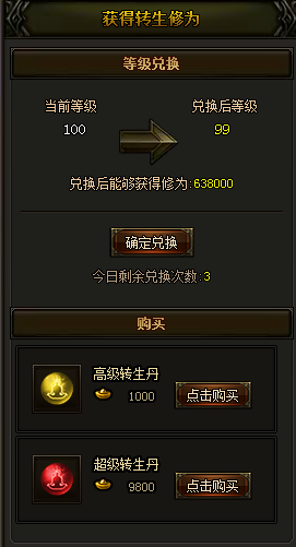 1、人物达到100级以后可以降低自己的等级来兑换转生修为值,低于100级将不可降级兑换修为!每天限制兑换5次