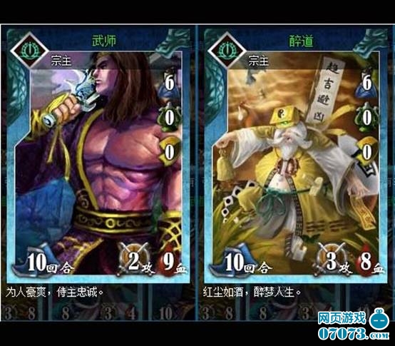 武师、醉道是前期新手引导必送的两张宗主卡牌,宗主属性都是带6兵,战斗属性则有略小不同,分别是10、2、9(战斗属性分指等待回合、攻击力、生命值)以及10、3、8,差距并不太大。实战中使用醉道更好,虽然比武师少了1点血,但多出的1点攻击可以在前期造成不小的杀伤力。