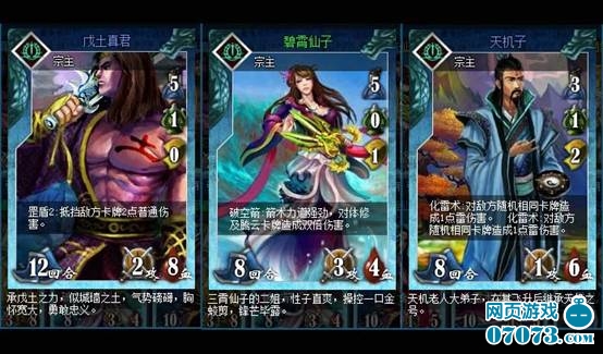 戊土真君(蓝)、碧霄仙子(绿)、天机子(蓝)是三个能带法宝或者符篆的宗主,且各自属性有差异,在搭配阵型(即卡组)时一定要根据宗主的技能、属性来配。