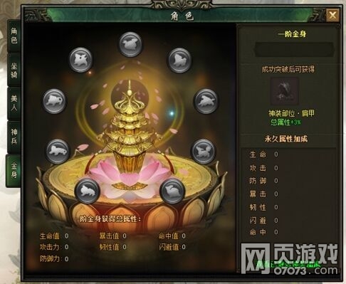 1、金身突破,在玩家等级达到50级时开启。点击角色面板中的金身标签,即可查看金身界面。