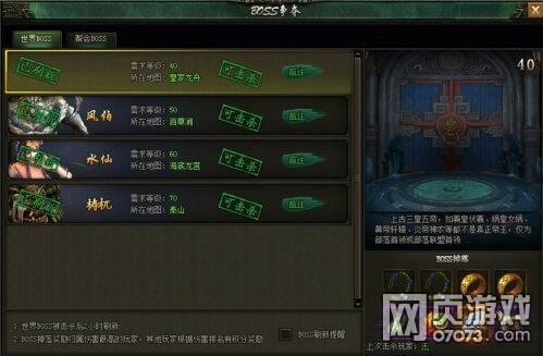 A、世界BOSS从被击杀后开始倒计时,倒计时结束后会重新刷新,击杀后就可获得大量的商城道具奖励。