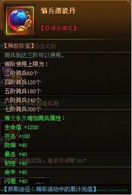 轩辕剑之天之痕骑兵潜能丹介绍,轩辕剑之天之痕骑兵潜能丹属性。活动期间累计充值达到500元宝,即可领取超值奖励。