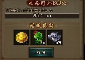 击杀野外BOSS可以获得活跃度,野外BOSS是游戏中的聚宝盆,在这些家伙身上我们可以获得任何我们想要的东西,当然这些需要一定的运气,笔者的运气比较好,击杀两次BOSS就掉落了2本技能书,比较给力的那种。