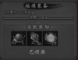 熔炼装备4次是可以获得活跃度的,我们在游戏中通过野外挂机和副本是可以获得很多装备的,装备品质差的对于我们穿戴来说,没有什么用这个时候我们就可以拿来熔炼了,装备熔炼后,我们可以获得大量的熔炼值,熔炼值满了可以获得相应的奖励。