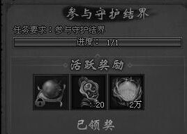 参与守护结界,在游戏中也是可以获得活跃度的,结界的守护,其实是比较难的,因为敌人实在是太多了,一波接一波,而且很多都是BOSS,我们守护的压力真的挺大的,但是在游戏中我们守护足够的关卡游戏中的奖励是比较高的,这点是我们游戏中最好的奖励了。
