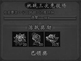 挑战三次竞技场,在目前的游戏中竞技场是游戏中最能看清自己战斗力水平的一个平台,我们可以看看自己在游戏中到底是一个什么程度,我们需要不断的挑战别人,或者说是挑战自己,与敌人战斗需要的就是战斗力,这里不需要技巧完全是战斗力的比拼。