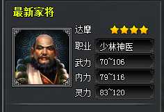 聚贤阁加入最新4星家将达摩,作为目前游戏历练地图中的终极BOSS,达摩拥有超高的武力/内力/灵力属性外,除了每回合为可以我方血量最低的人补血外,还掌握独一无二的复活能力——每场战斗能复活已经死亡的我方成员一次!