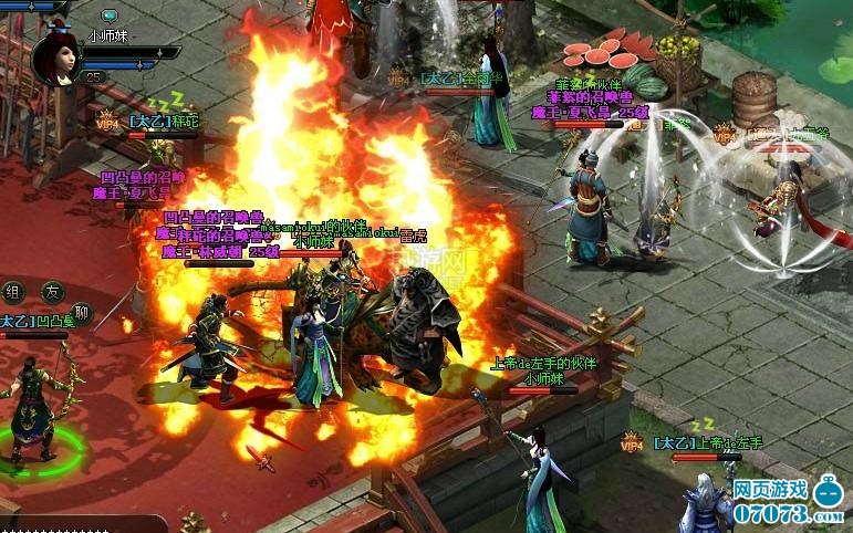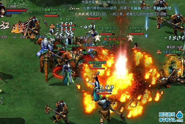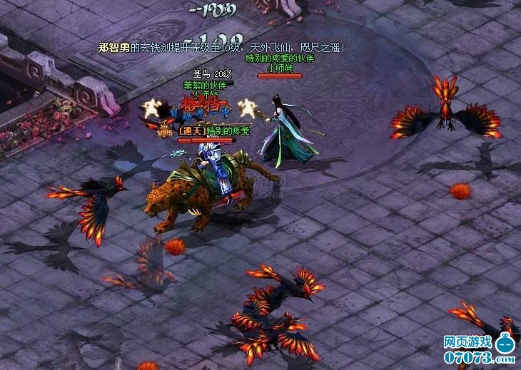一路做任务到25级,你会接到一个支线任务是“英雄擂台”,寻找雷虎比武的,共要击败雷虎手下的三员大将才算完成任务。雷虎雷虎,看名字真像方世玉里的雷老虎,同样是打擂台的。看下图,已有多个少年方世玉上台剥虎皮了,但见台上刀光剑影,打得难分难解。还是玄道最抢眼,一个火球下来便四下火光冲天,照亮大地,如火烧圆明园般。