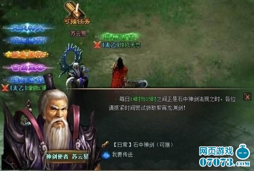 洪荒恶古纪年,天外焚坠一剑,末与惊龙山之颠,仙人道友听闻此事趋之若鹜,从四面八方闻风而来数以万人,石中神剑由此而生。不要以为是抗日,其实这里是PVP的场所。每天14:00——15:00之间可以在活动面板中报名进入,在地图中找苏云易领取任务后便可以尝试把剑,进行一次把剑后即可完成任务。海量经验和丰富金钱让你取之不尽。