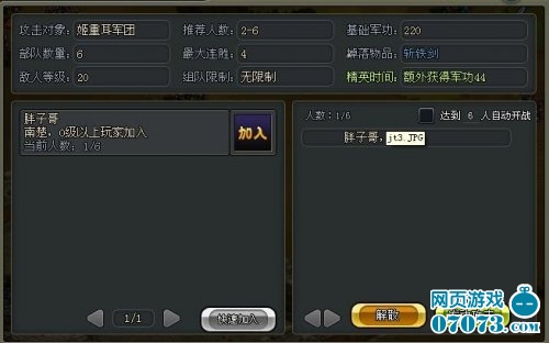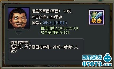 点击攻击按钮,进入组队攻打界面,您可以自己创建队伍,也可以加入其他玩家的队伍。13:00~13:30和20:00~23:00攻打npc军团,可以额外获得20%军功加成。