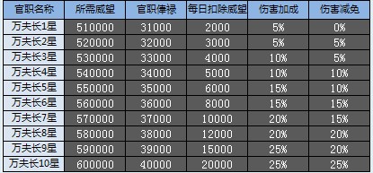 除了攻打敌国玩家获得威望外,参与演武场、参加地区战、进行地区投资都可以增加威望。当官职提升至千夫长10星后,还可以继续提升官职至万夫长级别,还可以获得攻防加成,不过万夫长以上官职每日会被扣除一定威望。