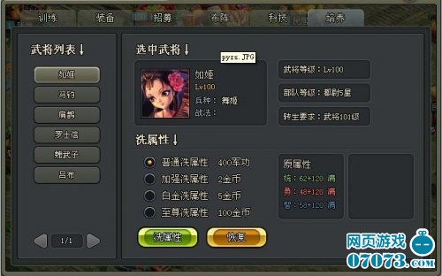普通洗属性:每次消耗军功,花费最低,当然效果也是最低的。如果您只想将武将的某一个属性洗高,那么建议您使用普通洗属性。