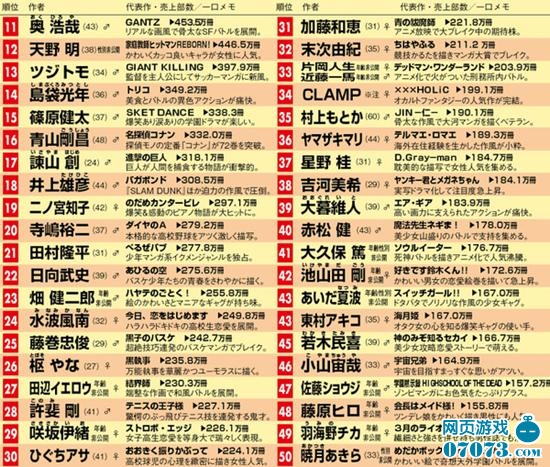 第四位的真岛浩,作品《妖精的尾巴》虽然画风非常的Onepiece但也是走出了一条自己的道路,漫画动画化后更加受到了关注,目前动画的集数已经超过了200集。第五位,久保带人。《死神》虽然有点不负当年之勇的感觉,但毕竟还有着底蕴。第六位,小畑健老师多年来一如既往的出好的作品之前的《棋魂》《死亡笔记》还有如今的《食梦者》,换言之小畑老师就是质量的保证。第七位,空知英秋,《银魂》的漫画火还是动画更火呢这个问题……第八位,荒川弘,又是一位女性漫画家,但她的作品和名字会让大家一致认为这是一位男性漫画家,我们要不是因为《钢之炼金术师》已经完结的话,排名会更高的。第九位,中村 光 《圣☆哥传》由于没有动画化所以知晓程度一般,倒是另一部《荒川爆笑团》的名气在国内更大一点,不但拍了两季的动画甚至还改拍成了日剧。第十位,椎桥宽 《滑头鬼之孙》这样的志怪漫画其实挺多的,但他能独树一帜却不易。