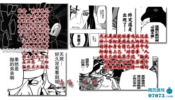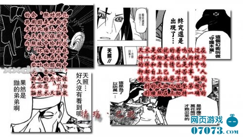 这一部分是补加在本篇分析里面的。是对最近几话和之前内容的一个联系。看了最近几话,最大的爆料莫过于别天神了。那么回想别天神从进入鸣人的口中到如今出现。他的确反应了鼬一连串的冒险和保险。在这里我解释一下我对鼬使用天照的看法。就鼬的描述就是,他对“别天神”这个术的设置是自己的瞳术发动的时候,别天神就开启了。所以他假设佐助会移植自己的眼睛。但是实际上,佐助没有移植自己的眼睛。因此他这个时候发动天照是有他的用意的。其实即使佐助没有移植鼬的眼睛,在佐助的身上还是拥有鼬的瞳术。对了,就是鼬在死前对佐助上的一个保险----当佐助遇到斑的瞳术的时候就会发动天照。这个天照出了让佐助远离斑之外,还有一个就是为了以后别天神所做的准备。佐助一旦要对木叶实施报复,就必然会用到这么毁灭性的一招。这从佐助的战斗模式可以看出,遇到较强的对手总会使用天照。因此鼬此时对鸣人用天照不是为了杀鸣人,而是为了试验施加在鸣人体内的别天神会不会应天照而开启。如果行的话,那么对佐助也会有效果了。