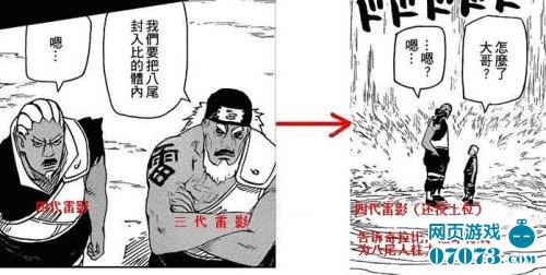 下图发生在上一图之后,时间间隔没多久,此时的奇拉比看不出和上图的区别,两者的时间间隔估计就几个月。这时的三代雷影还在世,四代还没上台,八尾即将封入奇拉比体内。