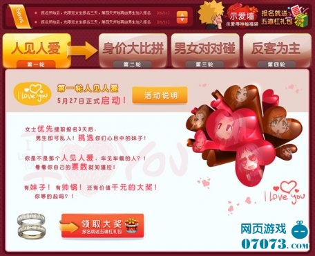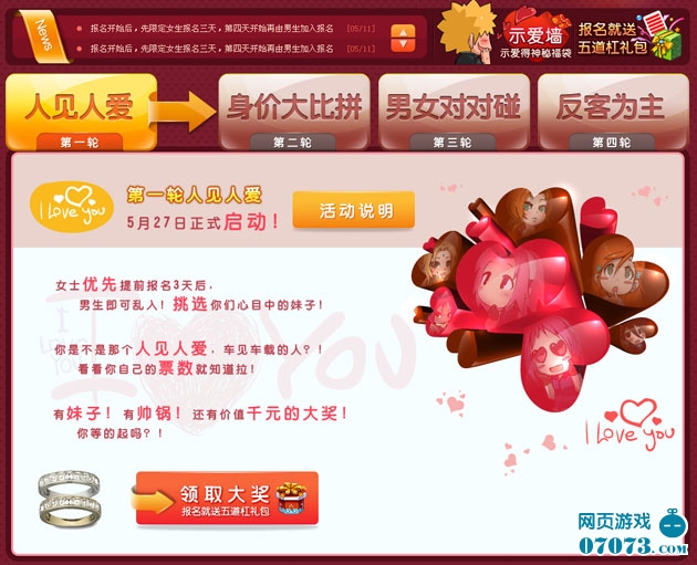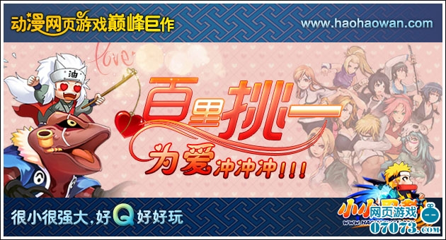 《小小忍者》“百里挑一”爱情对对碰5月27日15点整火爆开启,马上报名参与,轻松掌握沟女秘籍,让你绝不错过任何一个“恋爱”机会。只要闯过一道道美人关卡的考验,就能迅速甩掉单身包袱,与百位美女们高调约会,倾心畅谈对幸福的感悟,让我们为爱冲冲冲!!!