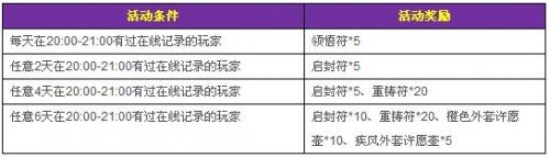 活动期间内,在每晚20:00-21:00有过在线记录的玩家,持续天数越长获得奖励越丰厚。