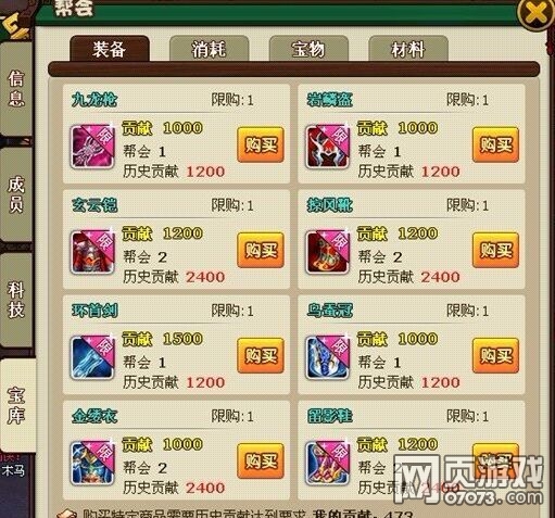 帮会附属商店,按公会等级开放新商品,界面如下