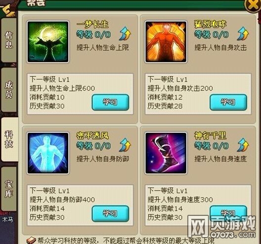 帮会科技,升级后可以提升帮会成员的多种能力,如攻击加成、防御加成、屯田产量等等。