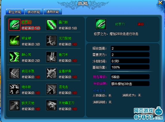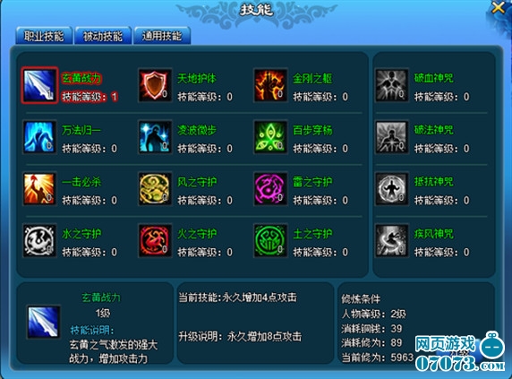 这些技能无法主动释放,而是通过学习并修炼此技能提高玩家的属性,如攻击力,躲闪,血量,抗性等属性,升级这些技能需要人物等级,铜钱和修为,这些条件都可在战斗与任务副本中累计。