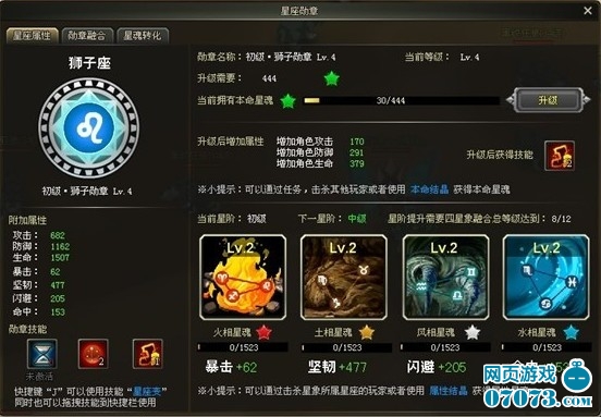 玩家在达到10级后获得本命星座的星座勋章,通过消耗本命星魂升级勋章可获得勋章属性和勋章技能。