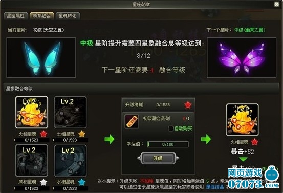 每个星象融合升级在消耗对应属性星魂的同时,也需要消耗的道具,勋章融合等级提升需要玩家主动操作。
