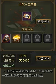 当玩家材料收集完成之后可以通过物品制作装备,此处也提供了快捷入口,通过元宝合成制作。