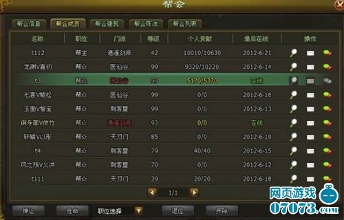 查看帮会成员与在线状态,操作包括:查看成员信息、邮件与私聊