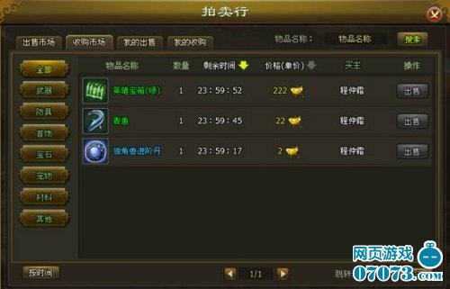 显示所有玩家倒卖出售的道具,玩家可以通过出售市场购买自己想要的道具,也可以通过左侧的道具分类更快捷的寻找相应的道具。