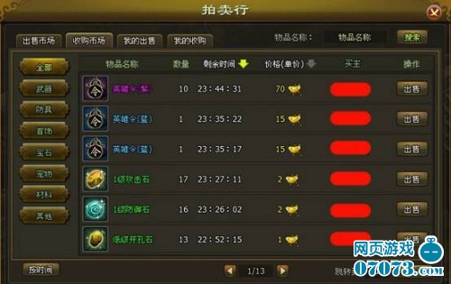 打开界面,玩家可以把自己多余的装备通过市场交易给其它玩家获得元宝或金钱(如下图)