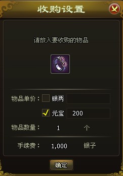 3. 将需要收购的道具拖入物品栏,输入收购价格(系统会自动抵押背包里的元宝或金币)收购时间到了通过邮件自动返还