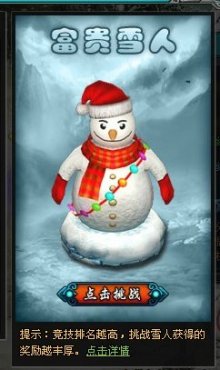 竞技场前列玩家在完成每日十次竞技场挑战之后可以获得挑战富贵雪人的机会,竞技排名越高,挑战雪人获得的奖励越丰富。雪人奖励“富贵吉祥礼包”分为四个等级,第一名可以获得橙色礼包,前十名为紫色,前50名为蓝色,51以后为绿色,礼包内有镶嵌宝石、成长丹、幸运符和英雄令,开启随机获得其中一种。