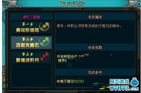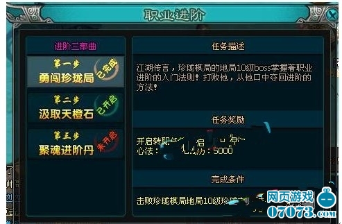 一、 玩家等级 ≥ 90级后,开启转职功能,点击转职图标,选择“我要进阶”完成一、二、三步。