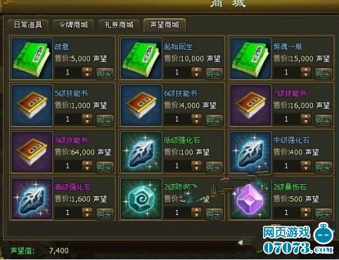 玩家只需占击商城,在声望商城就可以看见,某些技能和技能书可通过声望获得,对玩家的诱惑最大的就是技能书,7级技能对于玩家来说是一个坎。要 想获得7级的技能书可以通过购买4级的技能书,然后合成,但需要大量的游戏币,并不是一般的玩家可以承受得起的经济压力。而声望成为获得7级及以上技能书 的最佳途径。