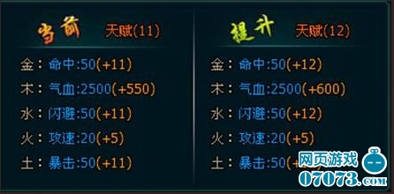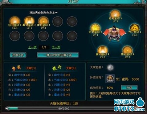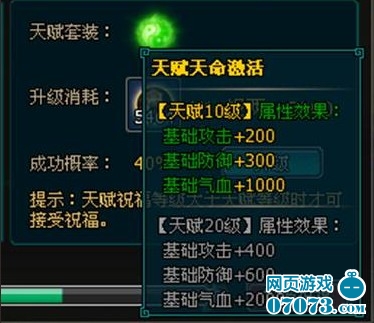 通过天赋系统还可以进一步增强天命所带来的属性加成。使用天赋丹与银两可以强化天赋,但天赋等级的提升和强化装备一样有一定的成功机率,升级成功则天赋提升一级,失败减少一级。赋祝福等级高于当前天赋时,可接受祝福,将当前天赋等级提升到祝福等级,需消耗天赋祝福值当前总值的20%。天赋达到一定等级后,激活天赋额外套装属性。